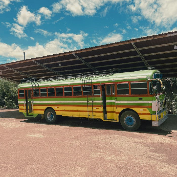 Auf dem Weg zu Juan Ramón und seiner Finca La Dueña entdeckten wir einen alten Bus auf einem Parkplatz und hielten kurz für ein paar Fotos. Die knalligen Farben, deren Kombination und dieser Retro-Look des Busses haben uns sofort gepackt – ein absoluter Vibe, mitten im Herzen Nicaraguas.